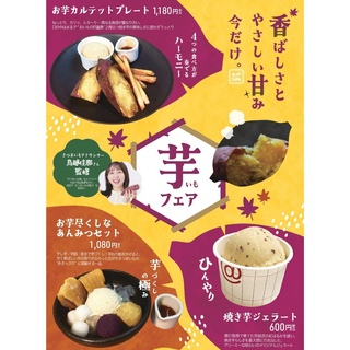 秋の味覚。期間限定!「さつまいもフェア」販売中! 香ばしさとやさしい甘み、今だけ。 旬のさつまいもを贅沢に使った、さつまいも尽くしの期間限定メニューが新登場🍠 ▶お芋カルテットプレート ねっとり、カリッ、とろ〜り …異なる食感が重なり合い、口の中はまるで“おいもの四重奏” 際立つ焼き芋の美味しさに思わずうっとり ▶お芋尽くしなあんみつセット 干し芋・芋餡・蜜まで芋づくし!芋ねり飴をかけると、甘く香ばしい芋の香りがふわっと広がりさつまいもの“多才っぷり”に感動する一品 ▶焼き芋ジェラート 慣行栽培で育てた茨城県の紅はるかを使い、焼き芋らしさを最大限に引き出した、クリーミーな味わいのオリジナルジェラート 「さつまいもアナウンサー」鳥越佳那さん監修 さつまいもを愛でるアナウンサー/野菜ソムリエ。 テレビ局在籍中に農業番組を担当し、野菜ソムリエの資格を取得。 芋愛が高じて産地への移住も経験。 現在は「さつまいも博」などイベント司会や商品監修を行い、全国で“さつまいもの魅力”を発信中