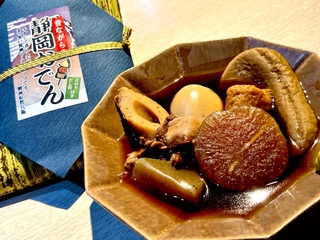 掲載日:2025-11-25 黒スープのおでんで楽しむ、冬の食卓。 ♦昔ながらの静岡おでん 900円(税込) 濃そうで濃くない、牛すじと魚介出汁の効いた醤油ベースの黒スープが味の決め手。 黒はんぺんなど7種の具材が楽しめます。 青のりだし粉付き。