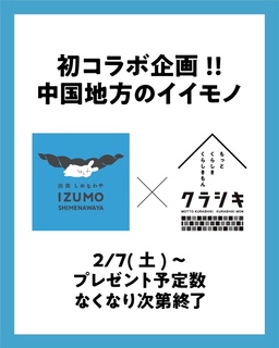 2/7(土)〜プレゼント予定数なくなり次第終了 期間中、「クラシキ」と「IZUMO SHIMENAWAYA(出雲しめなわや)」の2店舗でお買物のお客様、先着50名様にお買上げ粗品プレゼント!!