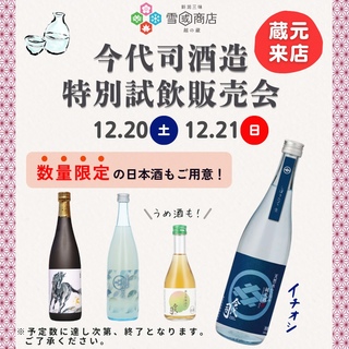 12/20(土)~12/21(日) 【今代司酒造】特別試飲販売会を実施いたします! 今回はなんと 今代司酒造の蔵元さんが来店! 1767年の創業以来、伝統的酒造りと挑戦を続ける今代司酒造。 新潟駅から最も近い酒蔵として、酒蔵見学も大人気です! 年末年始に飲む特別な1本や、今しか出会えない限定酒など、 蔵元さんとお話ししながら、実際に飲み比べてお選びください♪