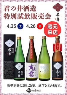 4/25(土)~4/26(日) 【君の井酒造】特別試飲販売会を実施いたします! 新潟県上越から蔵元さんが来店され、直接お話ししながら試飲をお楽しみいただけます。 今しか出会えない季節限定酒など 実際に飲んで、お話を聞きながらお選びください♪
