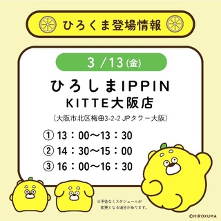 / ひろくまからのお知らせ🍋 (@hirokuma_1690) \ 3月13日(金) ひろくま書籍販売を記念して ひろしまIPPIN KITTE大阪店に 登場します。 遊びに来てくださいね! #ひろくま #HITひろしま観光大使