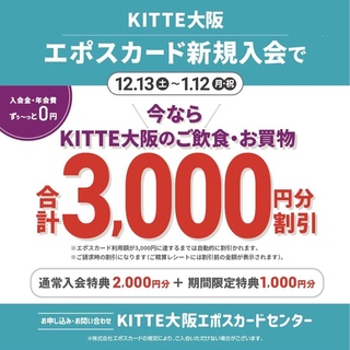 2025年12月13日(土)~2026年1月12日(月・祝) エポスカード新規ご入会キャンペーン開催中! 期間中、KITTE大阪エポスカードに新規ご入会いただきますと、通常2,000円分の入会特典のところ3,000円分【請求時割引】をプレゼントいたします。 (通常入会特典2,000円分+期間限定特典1,000円分) 1ヶ月間限定の特別キャンペーンとなりますので、ぜひこの機会をお見逃しないようお得で便利なKITTE大阪エポスカードにご入会ください。 【ご入会特典について】 ・ご入会特典の有効期限はカードご入会月含め6か月後末日となります。 ・一部ご利用対象外の商品、サービス、ショップがございます。 ・エポスカード本体(プラスティックカード)もしくはエポスペイでのクレジット払いが対象です。 ※エポスカードを登録したスマホ決済(クレジット払い、クイックペイなど)をご利用された場合、特典の対象外となります。 ・既にエポスカードをお持ちの方はお申し込みいただけません。(過去にエポスカードにご入会された方はご入会特典がつかない場合がございます) ・(株)エポスカードの規定によりご入会いただけない場合がございます。
