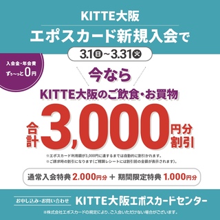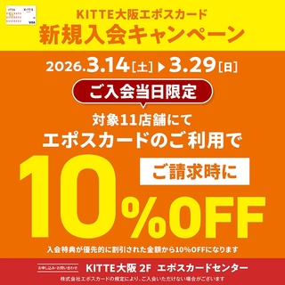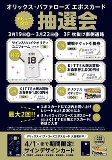 オリックス・バファローズ エポスカードのデビューを記念してエポスカード抽選会を開催致します。 【開催場所】3階吹抜け南側通路 【開催期間】2026.3.19(木)〜3.22(日) 【開催時間】11:30〜20:00 【内容】期間中KITTE大阪の店舗でエポスカードのご利用3,000円以上(税込)で1回抽選にご参加いただけます。 ※当日エポスカードに新規ご入会されると『+1回』抽選にご参加いただけます。 ★抽選会について★ ・エポスカードのクレジット利用(税込3,000円以上)が対象です。レシート(クレジット利用控え)をお持ちください。 ・当日のレシートが対象です。※複数レシートの合算は不可。 ・エポスカード新規ご入会で『抽選+1回』は、オリックスバファローズ券面か、KITTE大阪券面でのご入会が対象です。 ・株式会社エポスカードの規定によりご入会いただけない場合がございます。 ・内容は予告なく変更、中止となる場合がございます。 ・一部対象外の商品、ショップがございます。