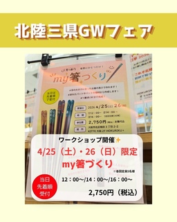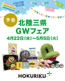 4/22(水)〜5/5(火)は、北陸三県GWフェア を開催します! 今年のゴールデンウィークは HOKURIKU+へ! 箸作り体験などの各種ワークショップや、 こどもの日特別企画、子供向けグッズの特別販売など盛りだくさん。 第2回GW推しうまいもん総選挙 in HOKURIKU+ も開催予定! 各県10商品がエントリー! 皆様の推し商品を教えてください!店舗にて投票をお願いします。(※どなたでもご参加いただけます) ゴールデンウィークは家族みんなでHOKURIKU+に是非お立ち寄りください! 皆様のご来店をスタッフ一同心よりお待ち申し上げております。 ※予定内容は予告なく中止・変更になる場合がございます。