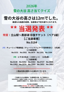 先日、4/8(水)~ 4/13(月)に実施いたしました「2026年雪の大谷高さ当てクイズ」において、投票にご参加いただきました皆様ありがとうございました。 2026年雪の大谷の高さは12mでした。 ご当選されたお客様は「お客様控え券」をご持参の上、 HOKURIKU+店頭までお越しいただき、スタッフにお声がけくださいませ。 当選番号を確認のうえ、景品引き換えとさせて頂きます。 【引き換え有効期限】 ・当選のお客様は4月30日(木)20時までに店頭にお越しくださいませ。 ・引き換え期限を過ぎた場合は無効となります。 引き続き、HOKURIKU+をどうぞよろしくお願いいたします。