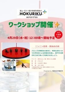 4/29(水・祝)限定でワークショップを開催します! 【ニンニン忍者・黒染めの術】 ブロンズの無着色の素材に、特別な液をつけて化学反応による黒着色を施し、顔や手の部分を工具で磨いて完成させましょう。 ※当日先着順受付 ※開催予定時間:12:00頃~開始予定 ※3,850円(税込)