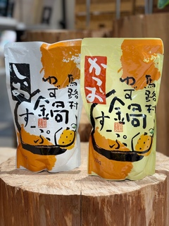 ゆずの香りとかつお出汁のコクでさっぱりした「かつお味」と、具材の味がより引き立つコクのある野菜だしベースのスープにゆずの香りがたっぷりの「しお味」。 秋冬限定の馬路村の「ゆず鍋スープ」です。 各¥450税込