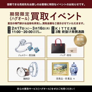 3月23日(月)の本オープンに先駆けて、プレオープン買取イベントを開催いたします。 査定の専門家がお品物を拝見し、買取金額をご提示させていただきます。 さらに、開催期間中の買取イベントご成約特典として、 ご成約金額10,000円ごとに買取金額を1,000円UPいたします! ※最大50,000円UPまでです。 ※ご成約特典は、期間中お一人様一回限りです。 ※他のキャンペーンとの併用は不可です。 ご予約不要で1点からでもお申し込みいただけますので、 お気軽にお立ち寄りください!