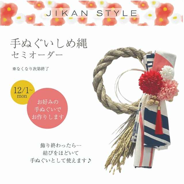 気が付くと、今年も残りわずかですね。 JIKAN STYLEではお好きな手ぬぐいでしめ縄をお作り致します。 ■費用■ 手ぬぐい代+2,500円 ■ご注文の流れ■ ①店頭のお好きな手ぬぐいを選ぶ ➁レジで注文・お支払い 1時間程でお渡しいたします (混雑時や時間により翌日お渡し等お時間をいただく場合あり) 年明け後は結びをほどき、 手ぬぐいとしてご使用いただけます。