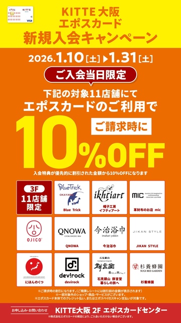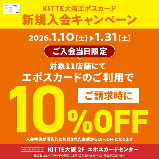 KITTE大阪エポスカード新規入会キャンペーン開催中! 【期間】2026年1月10日(土)~1月31日(土) 期間中、KITTE大阪エポスカードに新規ご入会で、「ご入会当日限定」3階の対象11店舗にてエポスカードのご利用で10%OFF(請求時割引)となります。 この機会に是非お得で便利なKITTE大阪エポスカードにご入会いただきお買い物をお楽しみください。 【キャンペーンについて】 ※入会特典が優先的に割引された金額から10%OFFになります。 ※ご請求時の割引になります。(ご精算レシートには割引前の金額が表示されます。) ※一部ご利用対象外の商品、サービス、ショップがございます。 ※エポスカード本体(プラスティックカード)でのクレジット払い、またはエポスペイのスキャン支払いが対象です。 ※既にエポスカードをお持ちの方はお申し込みいただけません。(過去にエポスカードにご入会された方は入会特典およびキャンペーンの対象外となる場合がございます) ※KITTE大阪エポスカードに新規ご入会いただいた方が対象です(郵送発行となる場合はキャンペーン対象外となります。) ※株式会社エポスカードの規定によりご入会いただけない場合がございます。